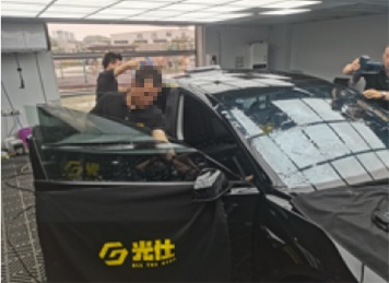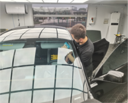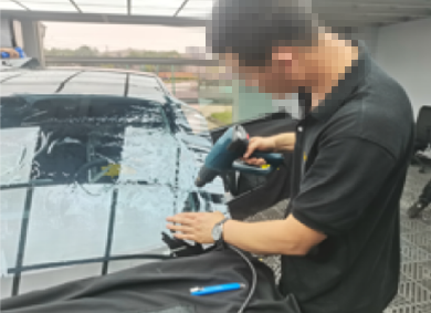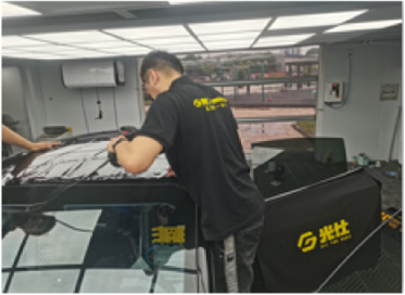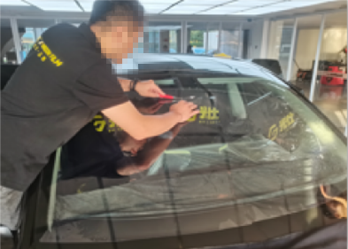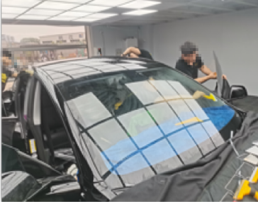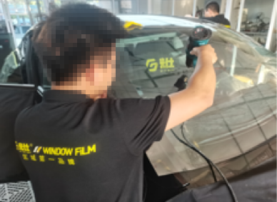 前窗膜裁剪与定型、后窗膜裁剪与定型,分别由二名技师主导完成;